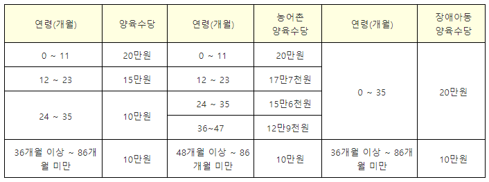 다만 주의할 점은 24개월 미만의 경우 부모급여를 받는다면 중복으로 지급되지 않습니다. 때문에 보통 부모급여 지급이 끝나는 24개월 이후 부터 10만원씩 받을 수 있으며 농어촌 및 장애아동의 경우 추가 금액 혜택이 있으므로 참고 하시길 바랍니다.