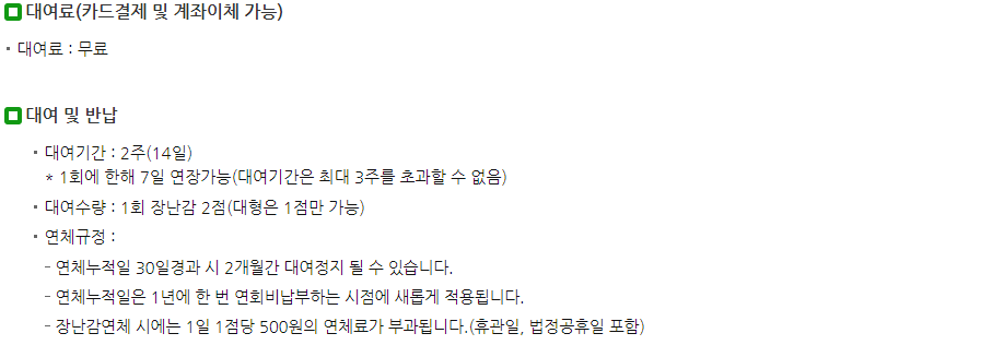 회원 가입을 완료한 후 장난감 대여료는 무료이며 대여기간은 기본 2주(14일)로 1회에 한하여 최대 7일 연장할 수 있습니다. 또한 1회 장난감 대여 시 소형은 2점, 대형은 1점씩만 가능합니다.