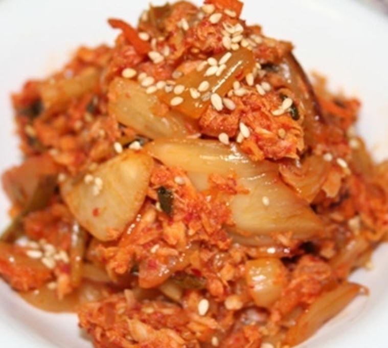재료: 신김치(묵은지), 참치캔, 양파, 대파, 설탕, 고춧가루, 참기름, 깨