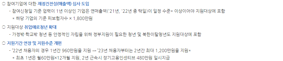 작년(22년) 기준 월 80만 원씩 12개월 총 960만 원 지원 규모에서 올해 최초 1년은 월 60만 원 지급에 2년 근속 시 480만 원을 일시로 지급해 주어 최대 1,200만 원 규모로 확대 개편 되었습니다.