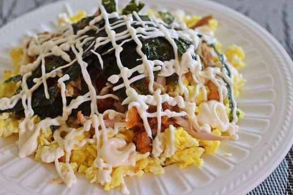 4) 재료 준비가 끝났으니 그릇에 밥을 담아주시고 볶은 양파와 치킨을 올려주세요. 그리고 마지막으로 스크램블 에그를 올리고 데리야끼 소스와 마요네즈를 취향 것 넣어주면 완성입니다. 기호에 따라 김가루나 파슬리 가루를 뿌려주셔도 좋아요.